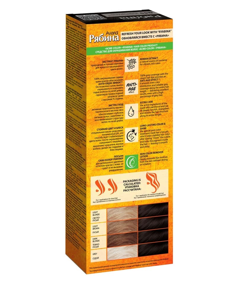 Complexul de caroten stă la baza formulei vopselei cremă Riabina. În timpul vopsirii, hrănește părul și protejează împotriva îmbătrânirii premature. Antioxidanții vă protejează părul de actiunea radicalilor liberi și de decolorare.