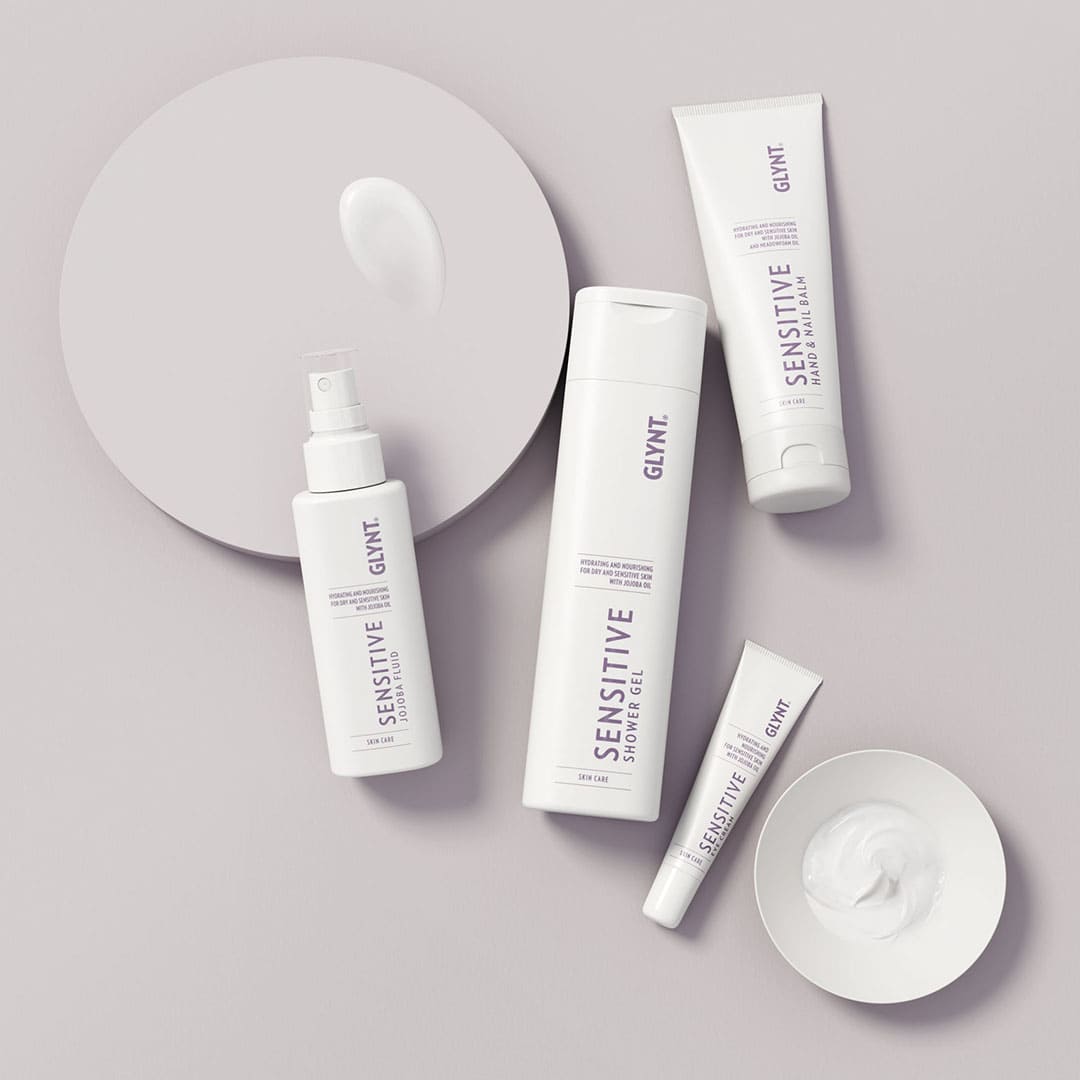 Sensitive Glynt - o cremă bogată in nutrienti, hrănitoare pentru mâini și unghii, care conține ulei de jojoba și ulei de flori de cuc. Nu este lipicioasa, se absoarbe rapid și, în același timp, compensează optim pierderea de umiditate.