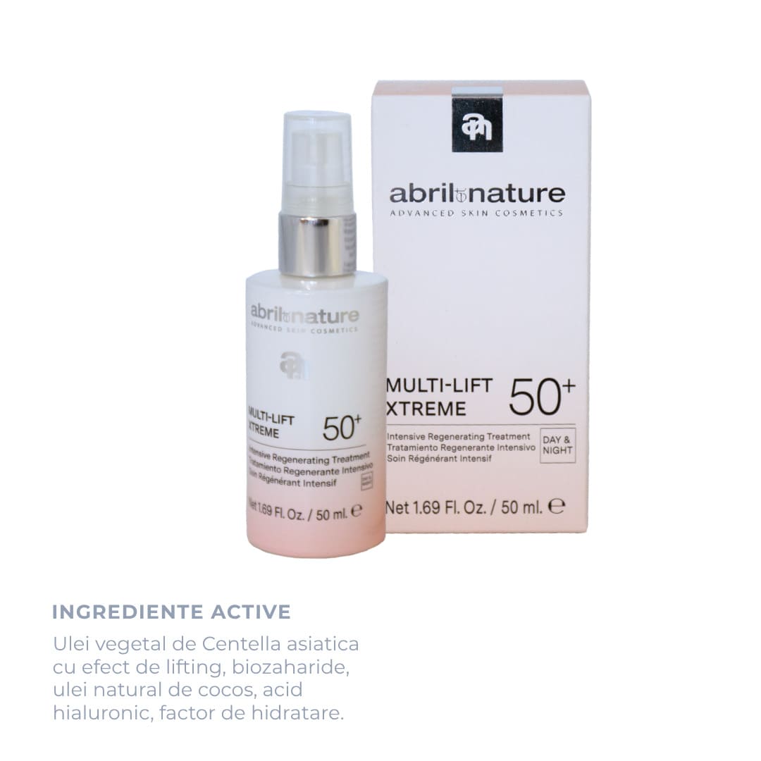Multi-Lift Streme 50+ от Abril et Nature — это интенсивный дневной и ночной уход, предназначенный для зрелой кожи с потерей упругости, глубокими морщинами и видимыми признаками старения. Формула сочетает в себе регенерирующие активные ингредиенты, мгновенную и длительную подтяжку, заполнение морщин и интенсивное питание.
