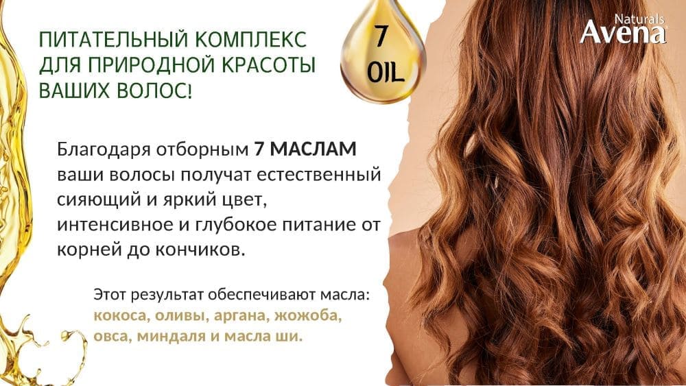 Стойкая крем-краска для волос Avena Naturals разработана не только для качественной окраски волос, но и для эффективного ухода за ними. Ее уникальная формула обогащена комплексом из 7 масел, которые предоставляют интенсивный уход и питание волосам.