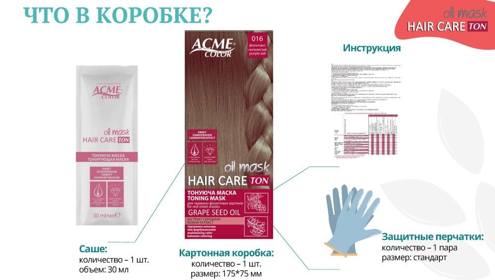 В комплекте: саше с тонирующей маской (30 мл) и пара перчаток.