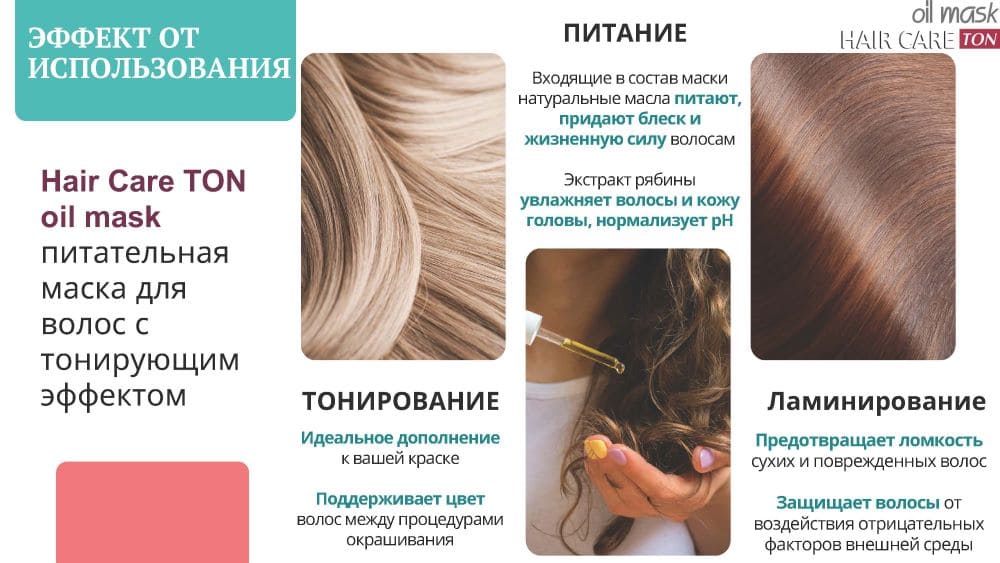 Цветовая гамма маски Hair Care Ton Oil состоит из 14 тонов, которые условно поделены на 4 серии. Каждая серия содержит в составе масло, усиливающее результат: