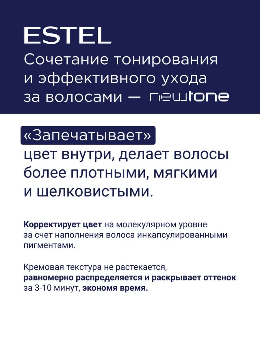 Тонирующая маска для волос Estel NewTone – это инновационный продукт, который одновременно обеспечивает деликатное тонирование и интенсивный уход, восстанавливая структуру волос и придавая им блеск. Продукт не содержит тяжелых металлов, аммиака, сульфатов и перекиси водорода.